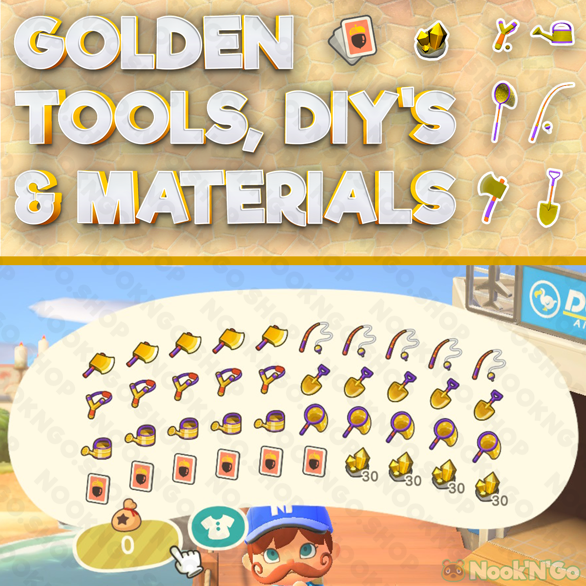 Golden Tools, Materials and DIY's. Delivered and dropped to your island. You will receive all the DIY's and materials needed to craft them: